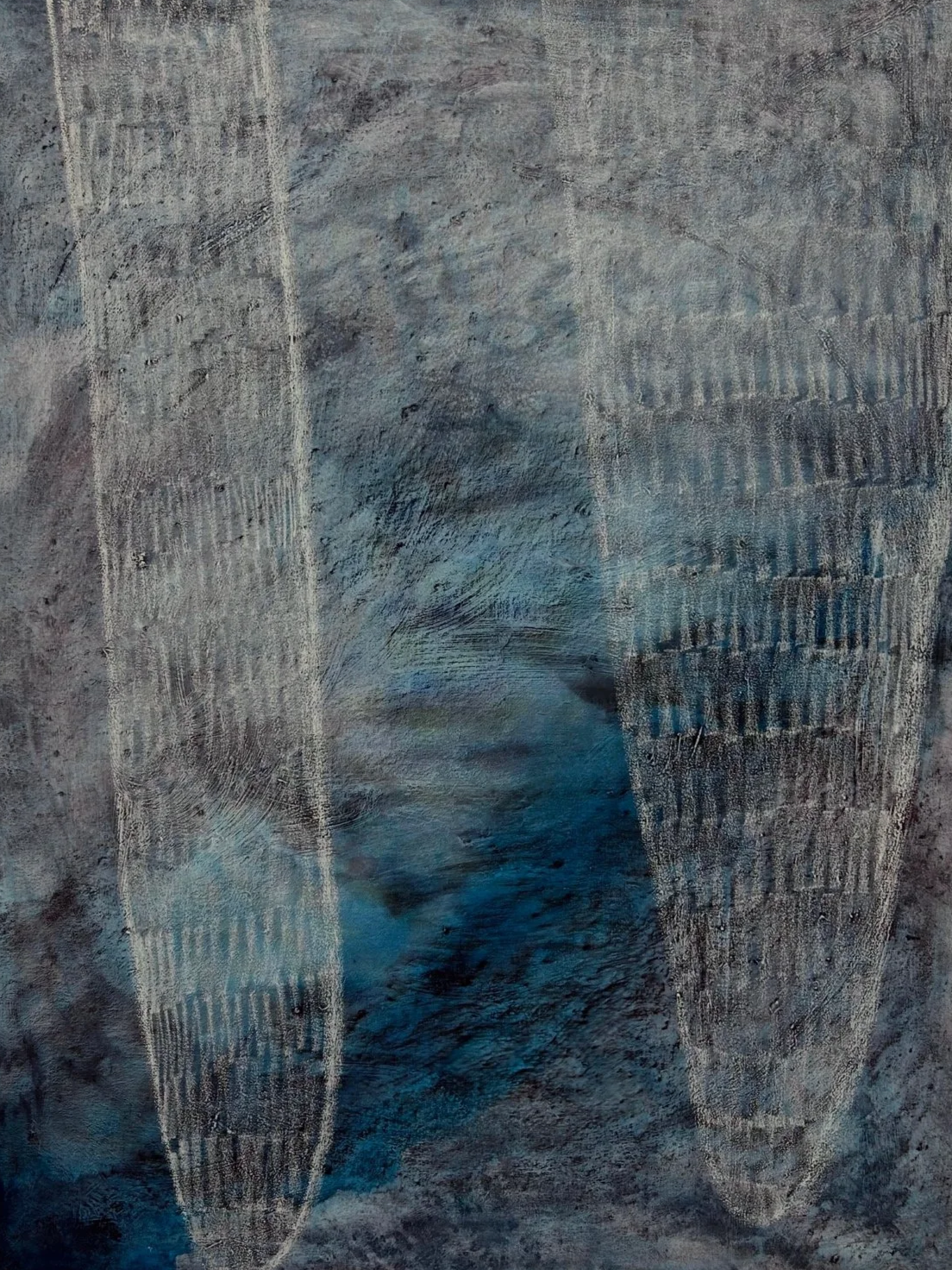 The works on exhibition in Slow Transition at LOAF Gallery, were made in collaboration with the rain and wind and form part of her current practice where she is experimenting with ways to embody natural processes evoking the atmosphere. The drawn motif on top is based on a cloud formation called ‘Mammatus Clouds’. These are used as a symbol of female power and our ancient and timeless connection to the natural environment.