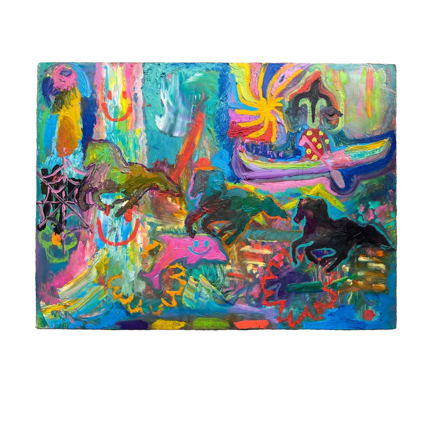Since becoming a mother, familiar art supplies commonly found at home, such as craft glitter, oil pastels, house paint, and rainbow coloured markers, have found their way into her studio, infusing her paintings with a sense of magic and playfulness.