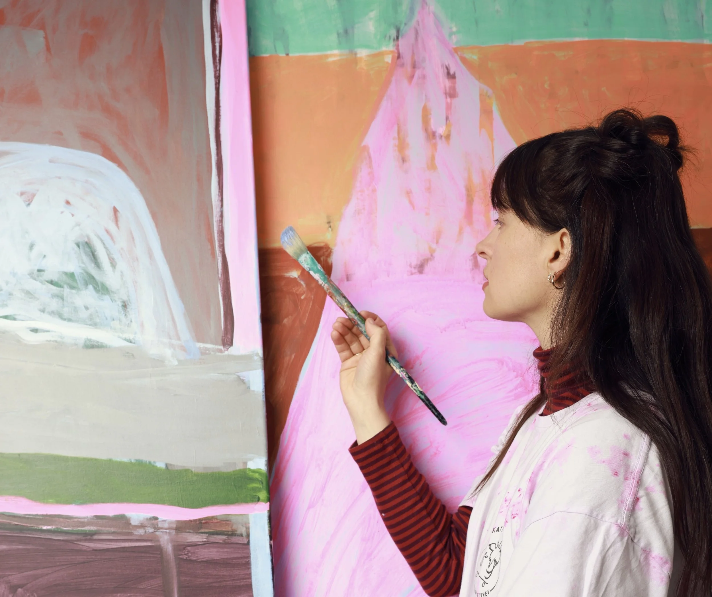 Katie Harvey is a multidisciplinary artist based in Eora/Sydney, originally from regional New South Wales. She completed a Bachelor of Fine Art (Honours) at RMIT University, studied abroad at the School of the Art Institute of Chicago, and completed a Master of Therapeutic Arts Practice at MIECAT. Traversing between semi-figuration and abstraction, her paintings layer colour-field expanses with shifting gestures and representational image-making — exploring spatial tension, movement and the sensory experience of being. Harvey’s work explores how painting can hold traces of what is felt and embodied. She investigates visual metamorphosis and the subtle slippages between technique and mark-making as ways of tracing changing psychological and sensory states. Through a sensitivity to light, colour and gesture, she examines the unstable terrain between observing and sensing — where presence and absence can continually blur.