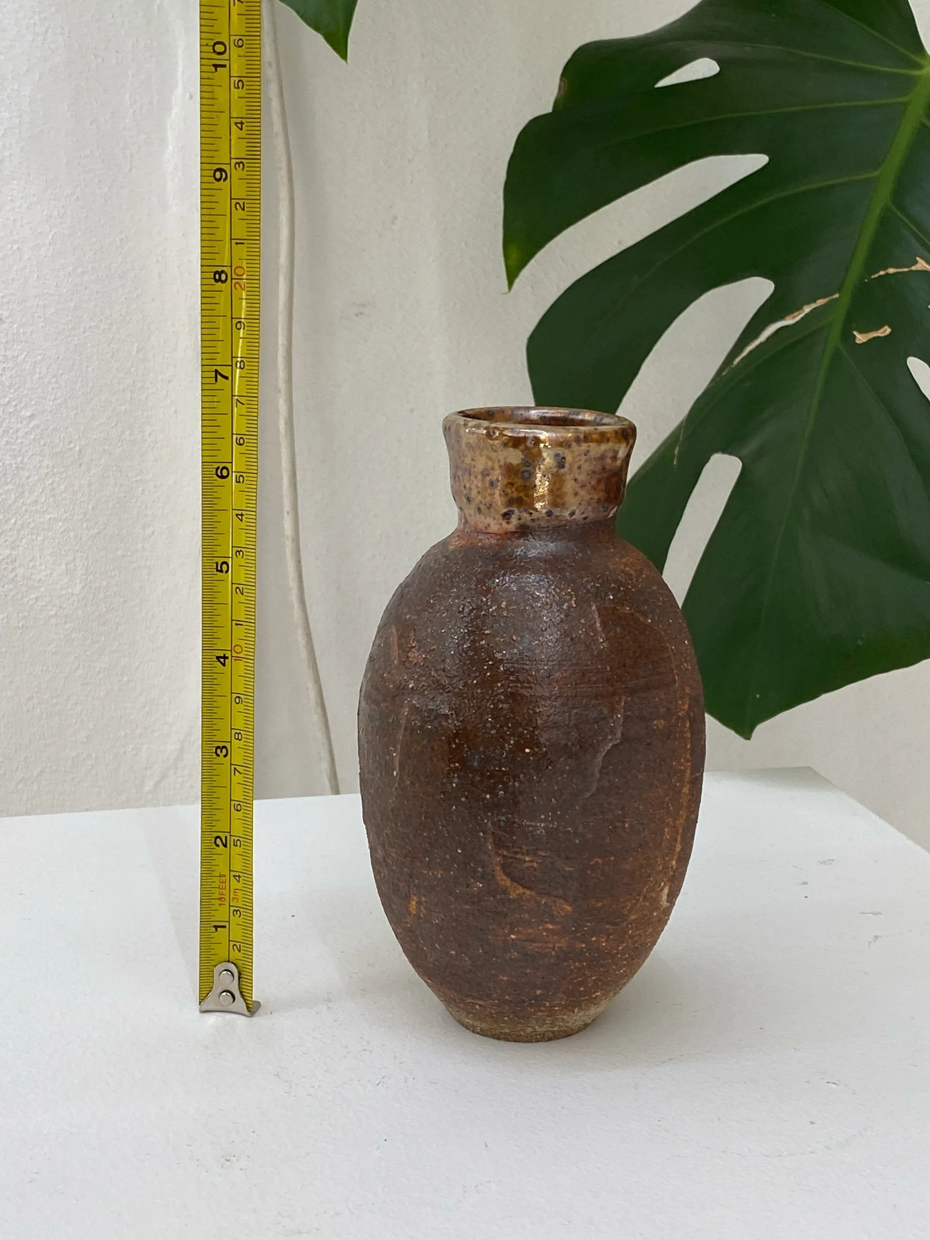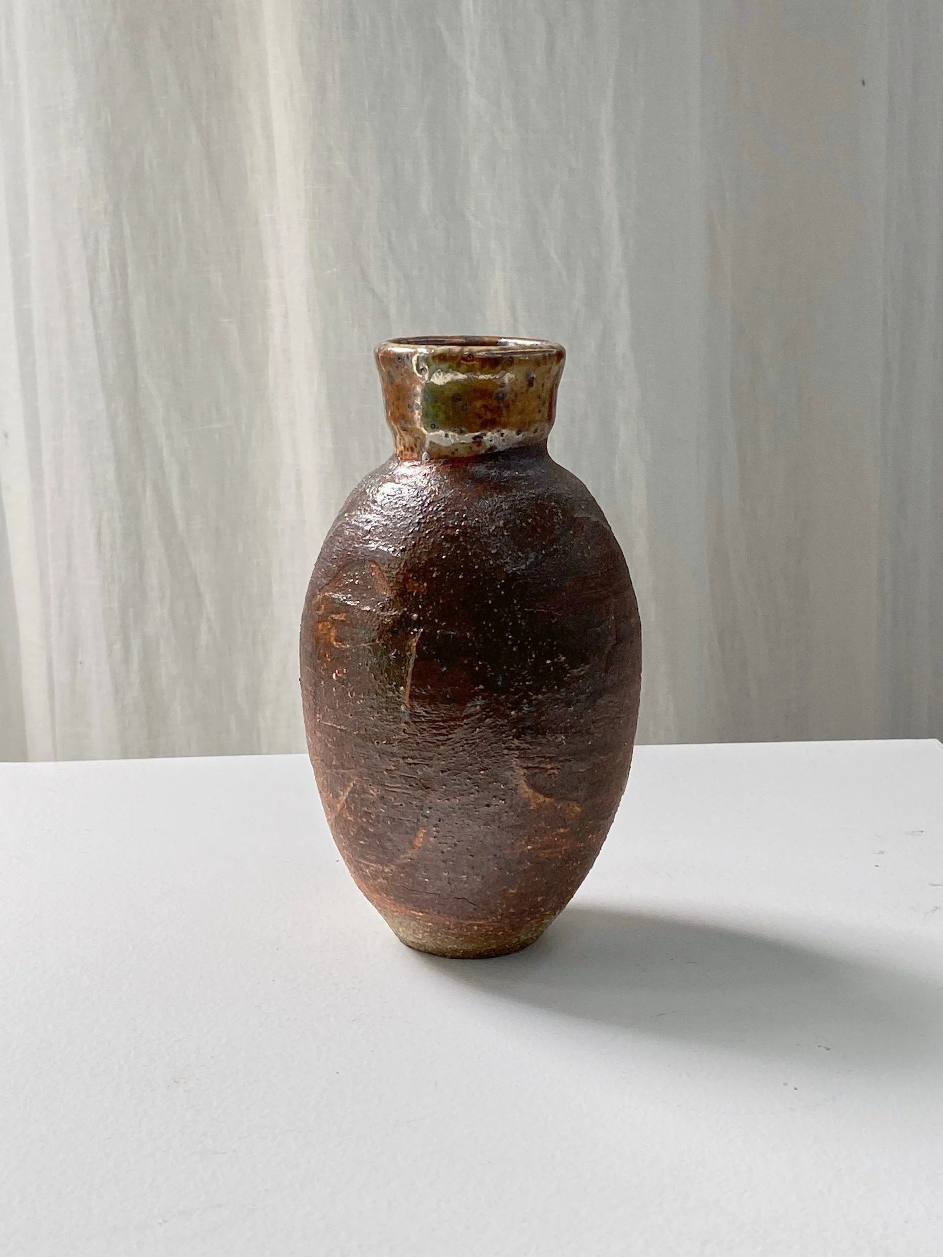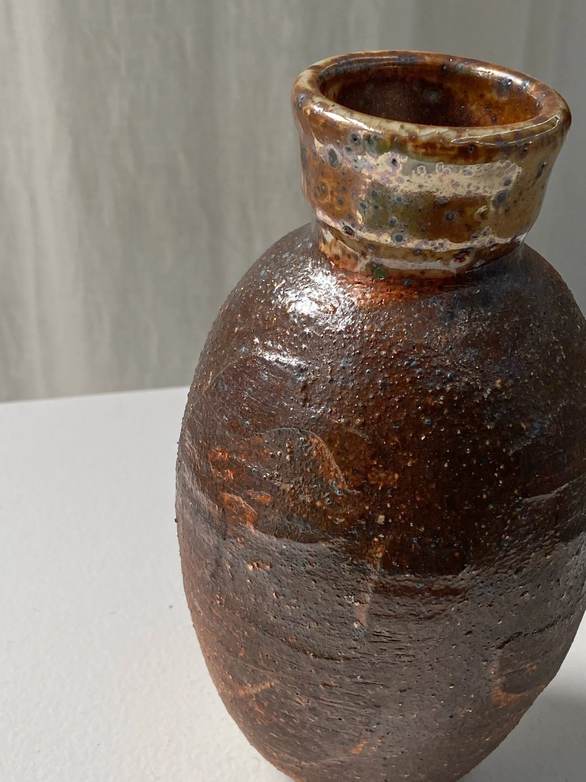 Peterson uses a traditional pottery technique in a fire-wood kiln to create rustic oxidised effects on the vase.