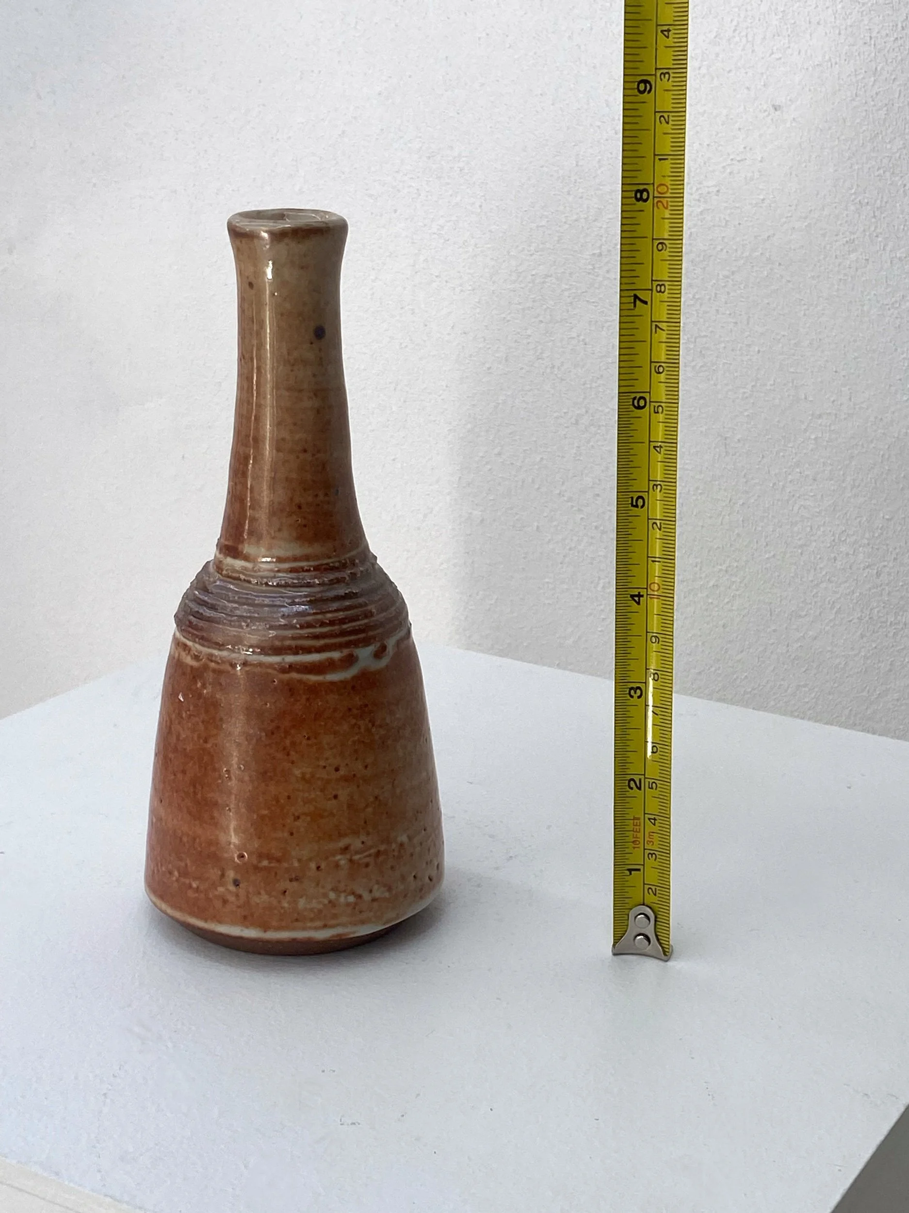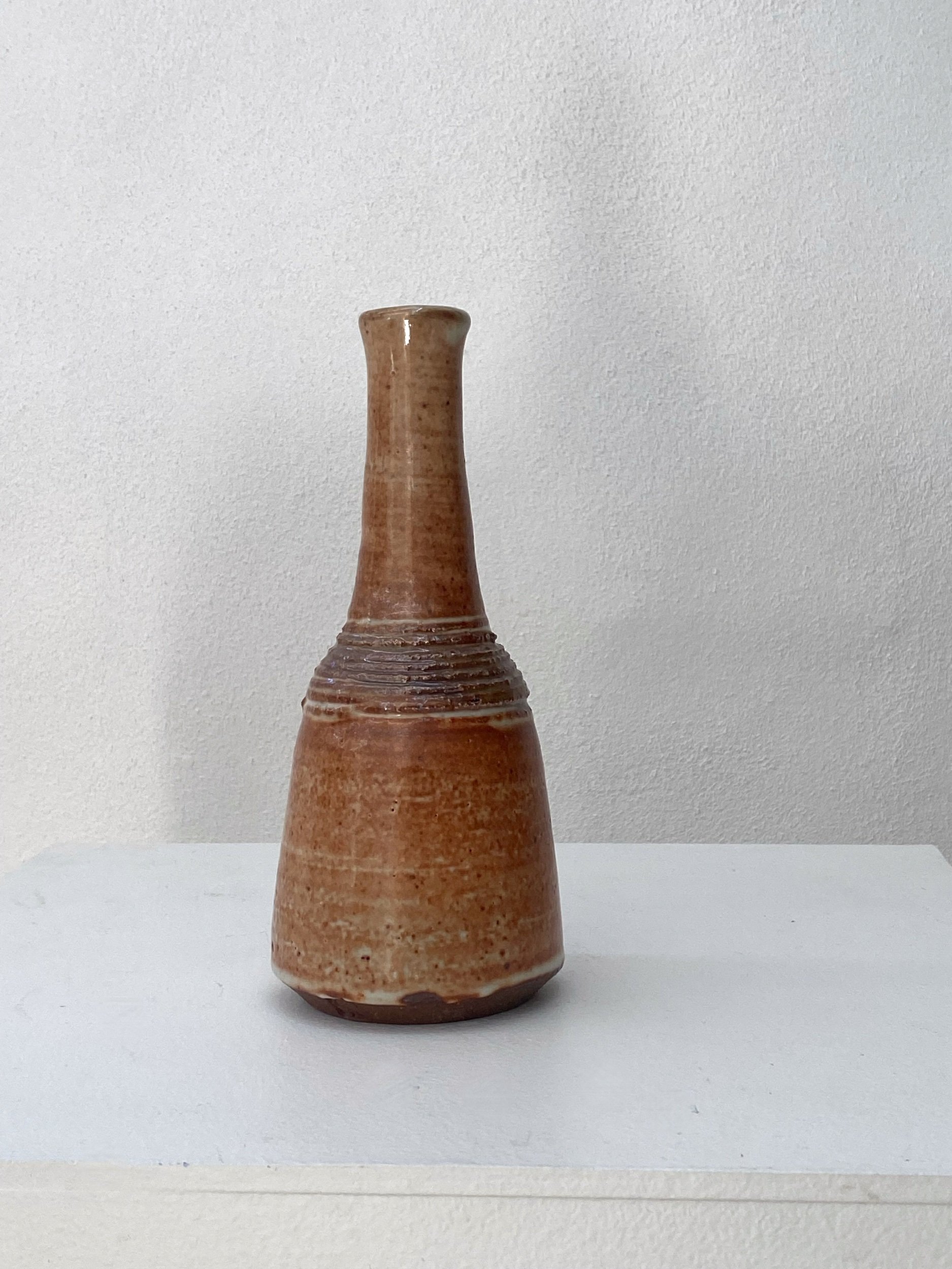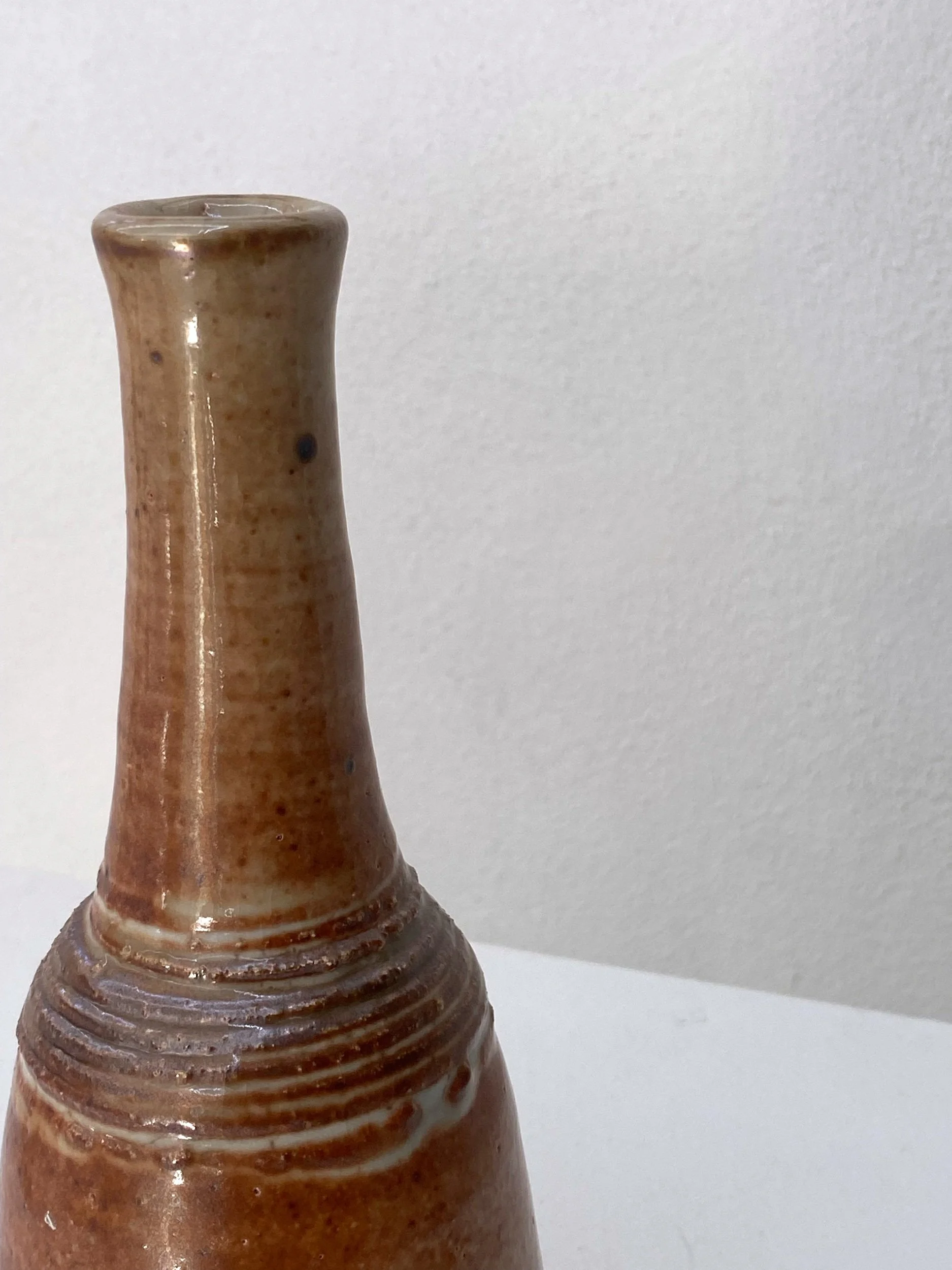 Peterson uses a traditional pottery technique in a fire-wood kiln process to create rustic oxidised effects on the vase.