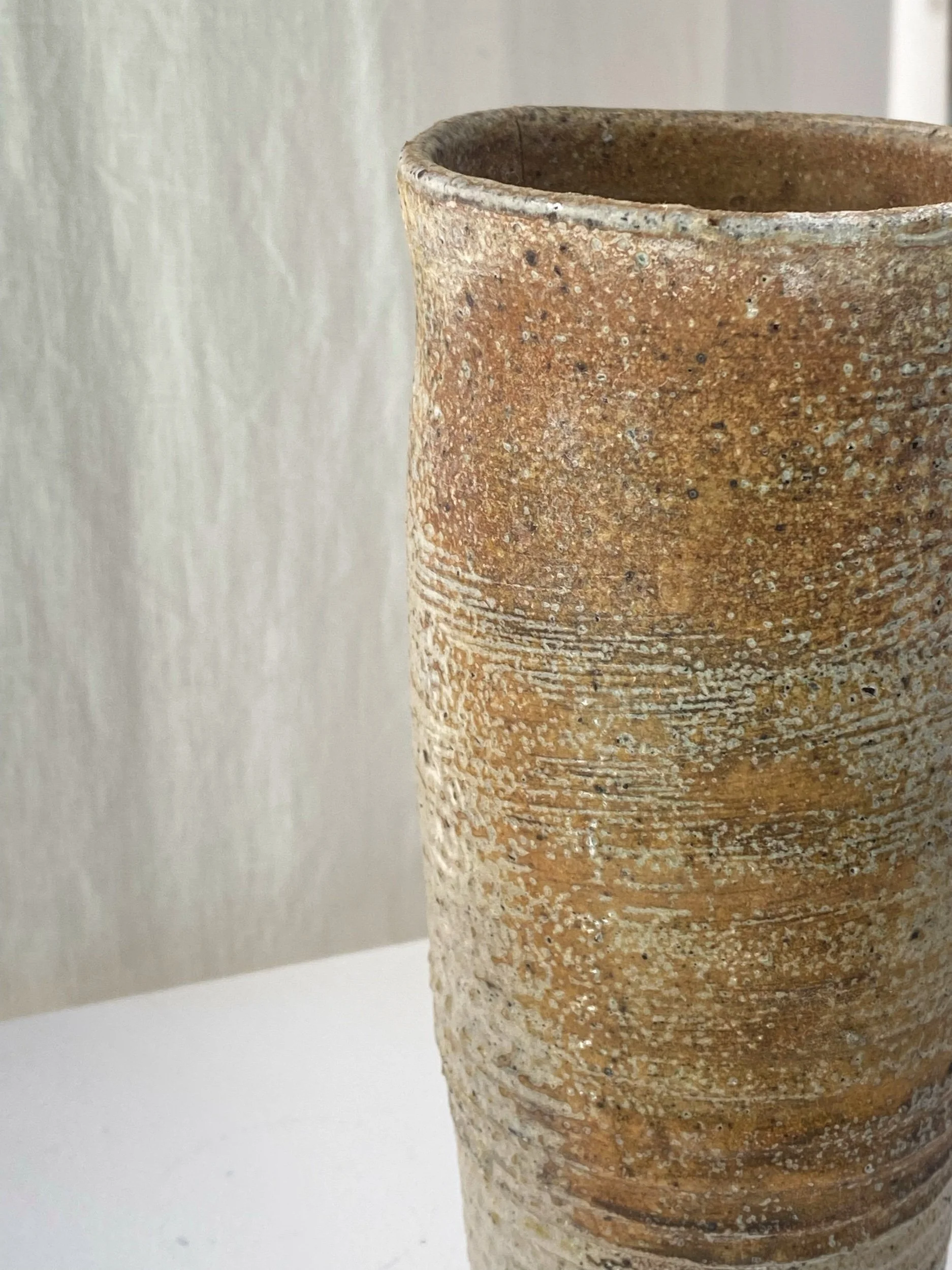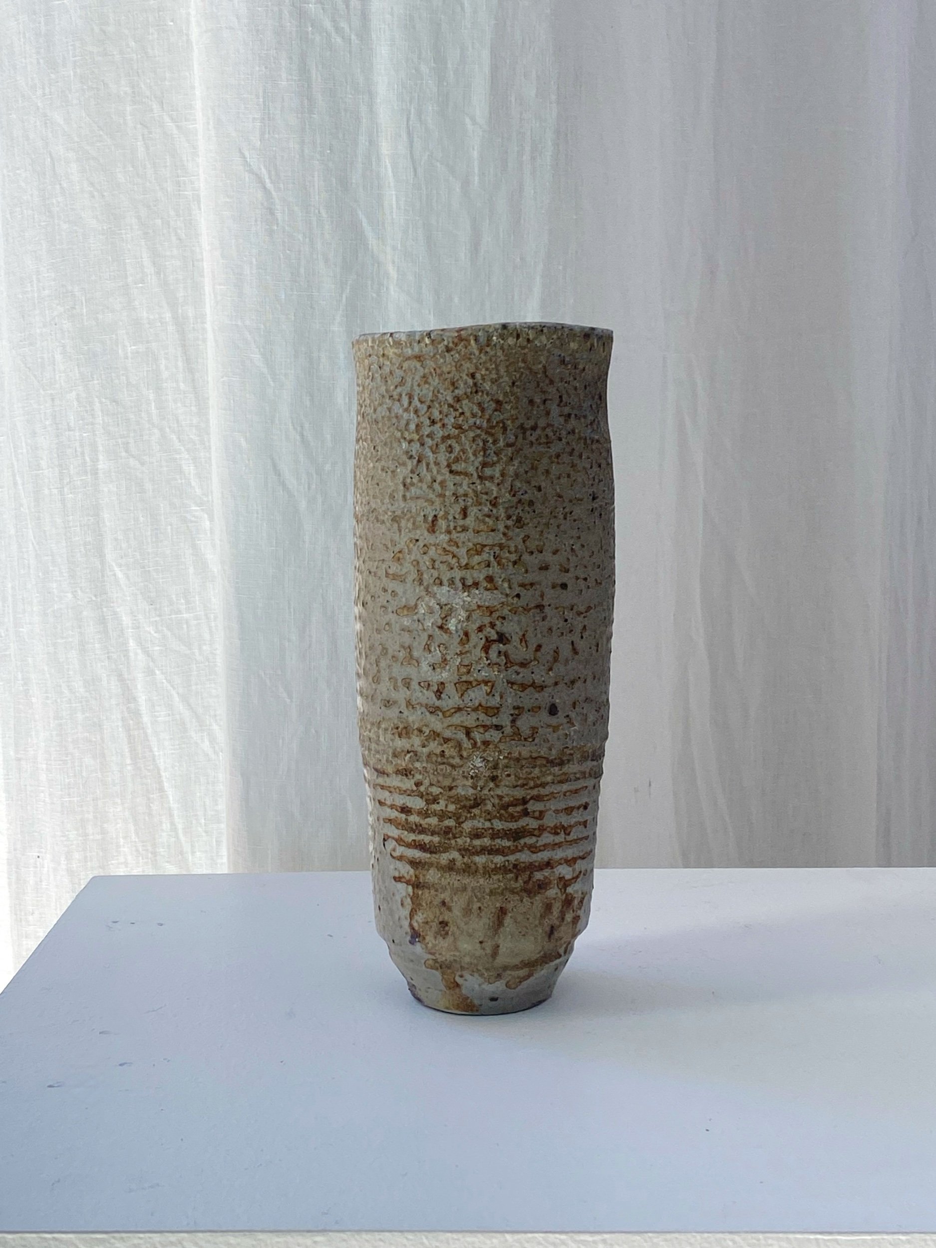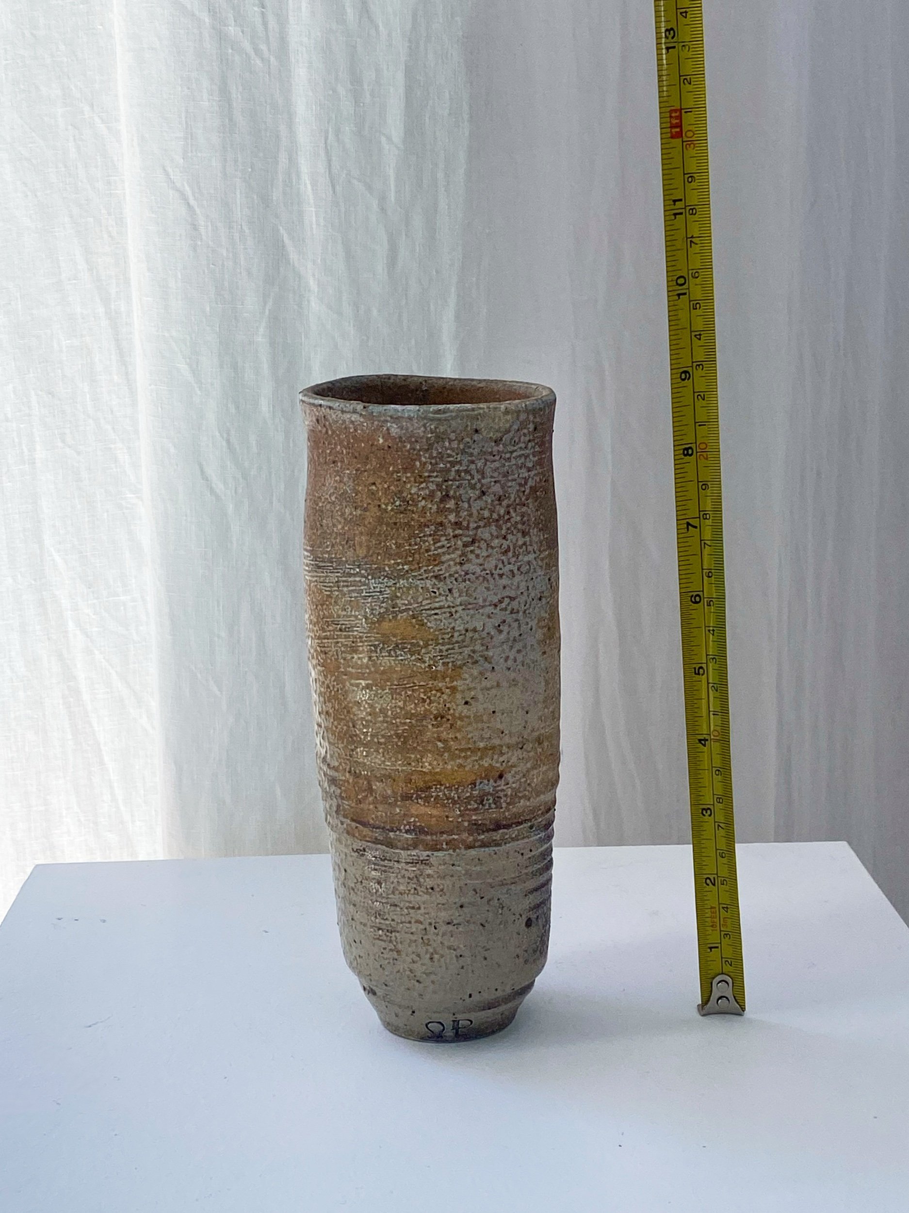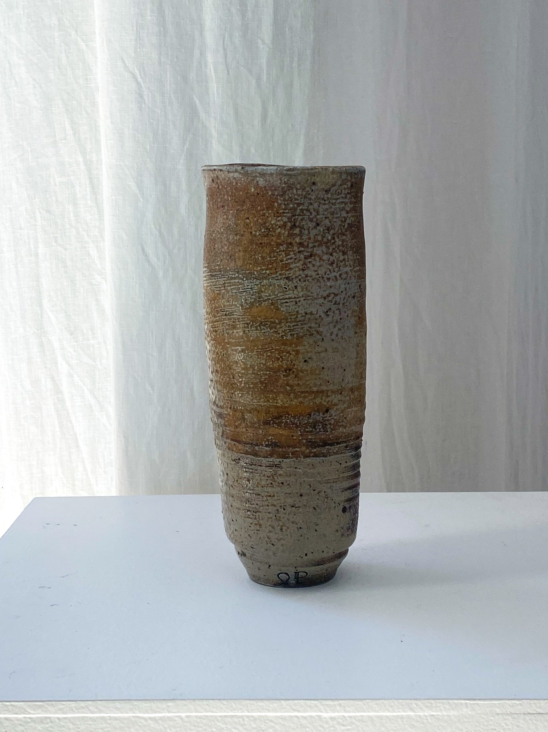 Peterson uses traditional pottery technique in a fire-wood kiln to create rustic oxidised effects on the vase.